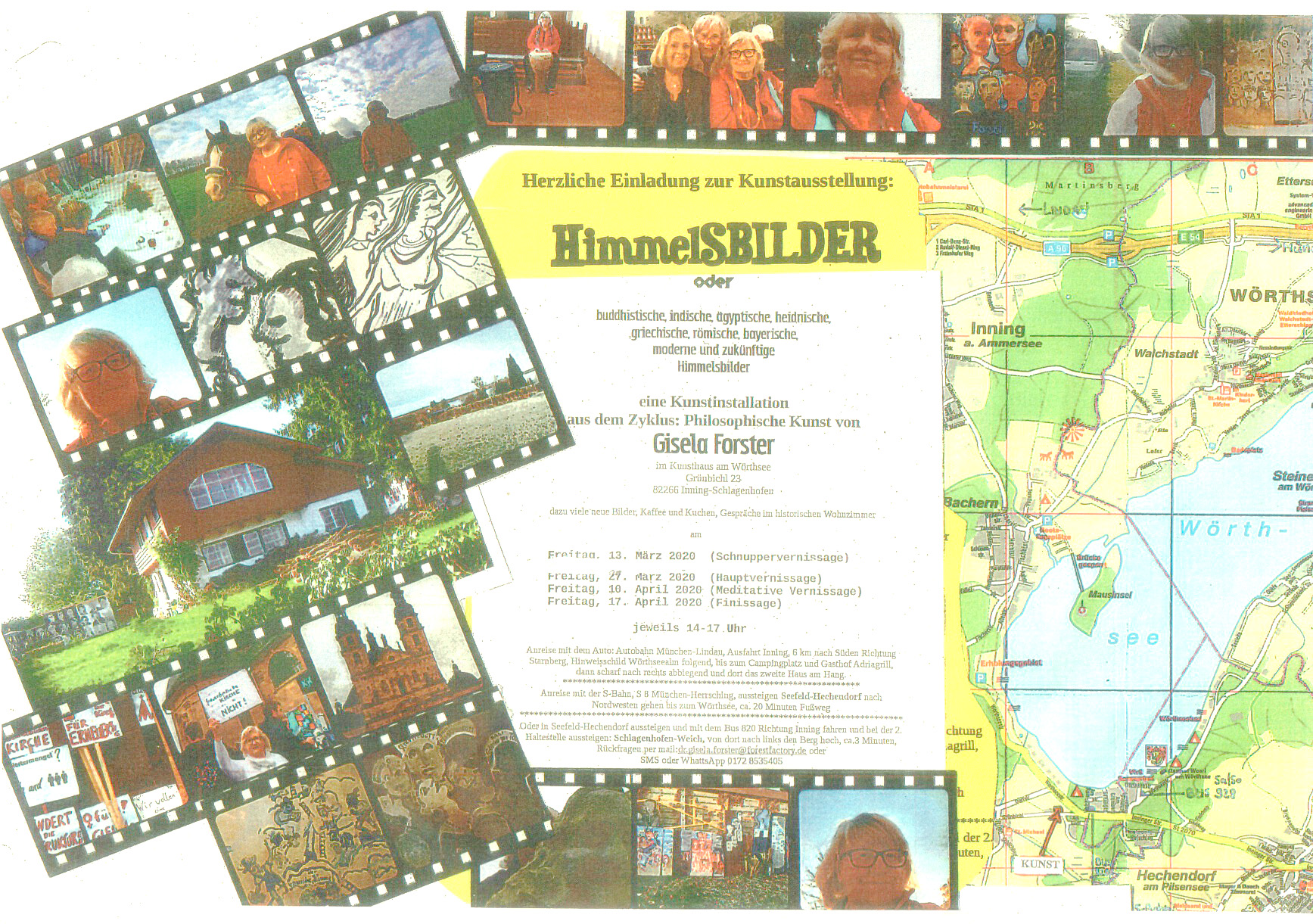 Götterdämmerung Herzliche Einladung zur Kunstausstellung: HimmelSBILDER oder buddhistische, indische, ägyptische, heidnische, griechische, römische, bayerische, moderne und zukünftige Himmelsbilder Eine Kunstinstallation aus dem Zyklus: Philosophische Kunst von Gisela Forster im Kunsthaus am Wörthsee, Grünbichl 23, 82266 Inning-Schlagenhofen Dazu viele neue Bilder, Kaffee und Kuchen, Gespräche im historischen Wohnzimmer Wegen der Corona-Ausgangsbeschränkungen: Bitte vor einem Besuch Rückfrage bei Dr. Gisela Forster E-mail: dr.gisela.forster@forestfactory.de oder SMS oder WhattsApp Telefon: 0172 8535405 Termine Freitag, 13. März 2020 (Schnuppervernissage) Freitag, 27. März 2020 (Hauptvernissage) Freitag, 10. April 2020 (Meditative Vernissage) Freitag, 17. April 2020 (Finissage) jeweils 14-17 Uhr ********************************************** Anreise mit dem Auto: Autobahn München-Lindau, Ausfahrt Inning, 6 km nach Süden Richtung Starnberg, Hinweisschild Wörthseealm folgend, bis zum Campingplatz und Gasthof Adriagrill, dann scharf nach rechts abbiegend und dort das zweite Haus am Hang. ************************************************************** Anreise mit der S-Bahn, S 8 München-Herrsching, aussteigen Seefeld-Hechendorf nach Nordwesten gehen bis zum Wörthsee, ca. 20 Minuten Fußweg ******************************************************************************** Oder in Seefeld-Hechendorf aussteigen und mit dem Bus 820 Richtung Inning fahren und bei der 2. Haltestelle aussteigen: Schlagenhofen-Weich, von dort nach links den Berg hoch, ca.3 Minuten, | Zurück zum Seitenanfang | Zurück zum Kunsthaus | Zurück zur Startseite www.kulturstrassen.org | Impressum |