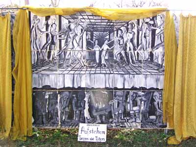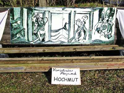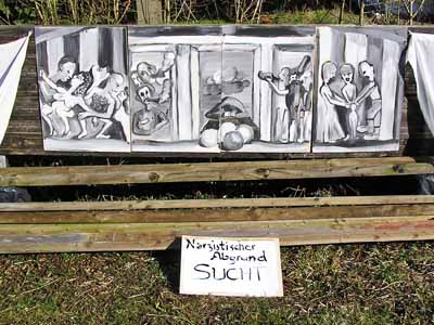 - Narzistischer Abgrund Sucht, die Betrunkenen, Drogensüchtigen, exsüchtigen, Unterdrückungssüchtigen und den Weinenden in der Mitte, der seinen Kopf auf seine Hände legt und in Tränen ausbricht, - den Narzistischen Abgrund Hochmut, dem Ich-weiß-alles-Besser-Abwerten, dem militärischen Hochmut, dem kirchlich-diktatorischen-Alleinseeligmachen-Hochmut und den Ich-bin-der/die-Schönste-Hochmut, der nicht ertragbar ist und der zum Weggehen zwingt, - den Narzistischen Abgrund Gewalt, der die Individualität durch Kriegskleidung verhüllt und Menschen zu Maschinen werden lässt, unter denen sich jeder nur vermummen kann, damit er durch Gewalttätige nicht erschlagen wird: Hilflos ist der Einzelne im Krieg, wenn Waffen und Zerstörung die Welt beherrschen. Nach dem Malen dieser 7 Abgründe des Menschseins, fühlte ich mich ruhig, hatte ich doch die Schrecken der Bedrohungen des menschlichen Daseins in den Bildern fassbar, fühlbar und sichtbar gemacht und die Bedrohung - wie mir schien - dadurch gebändigt. Ich legte die Bilder zur Seite und war entspannt. Dann prasselte Kritik auf mich nieder: Zu negativ, zu hoffnungslos, zu pessimistisch, man solle doch zeigen, dass es auch Kraft und Mut geben könne... Konkret, man sagte, es fehle nach diesen Karfreitags- und Karsamstagsbildem ein Osterbild. Auferstehung heißt das Osterfest. Wenn man das -er- weglässt, dann bleibt Aufstehen. Aufstehen aus der Passivität des Sitzens und des Alles-auf-sich-Niederprasseln-Lassens. Aufstehen, um sich zu bewegen. Aufstehen, um sich mit anderen zu sammeln, Aufstehen, um in Bewegung zu kommen. Die bisher am Tisch Sitzenden sind aufgestanden, auf den Tisch gestiegen, haben Freundinnen und Freunde mit heran genommen und umschlungen, sie sind aus der Starrheit erwacht und haben sich aufeinander zu bewegt. Sie tanzen, dachte ich, als ich malte und die Botschaft Tanzen statt Töten ging durch meinen Kopf.