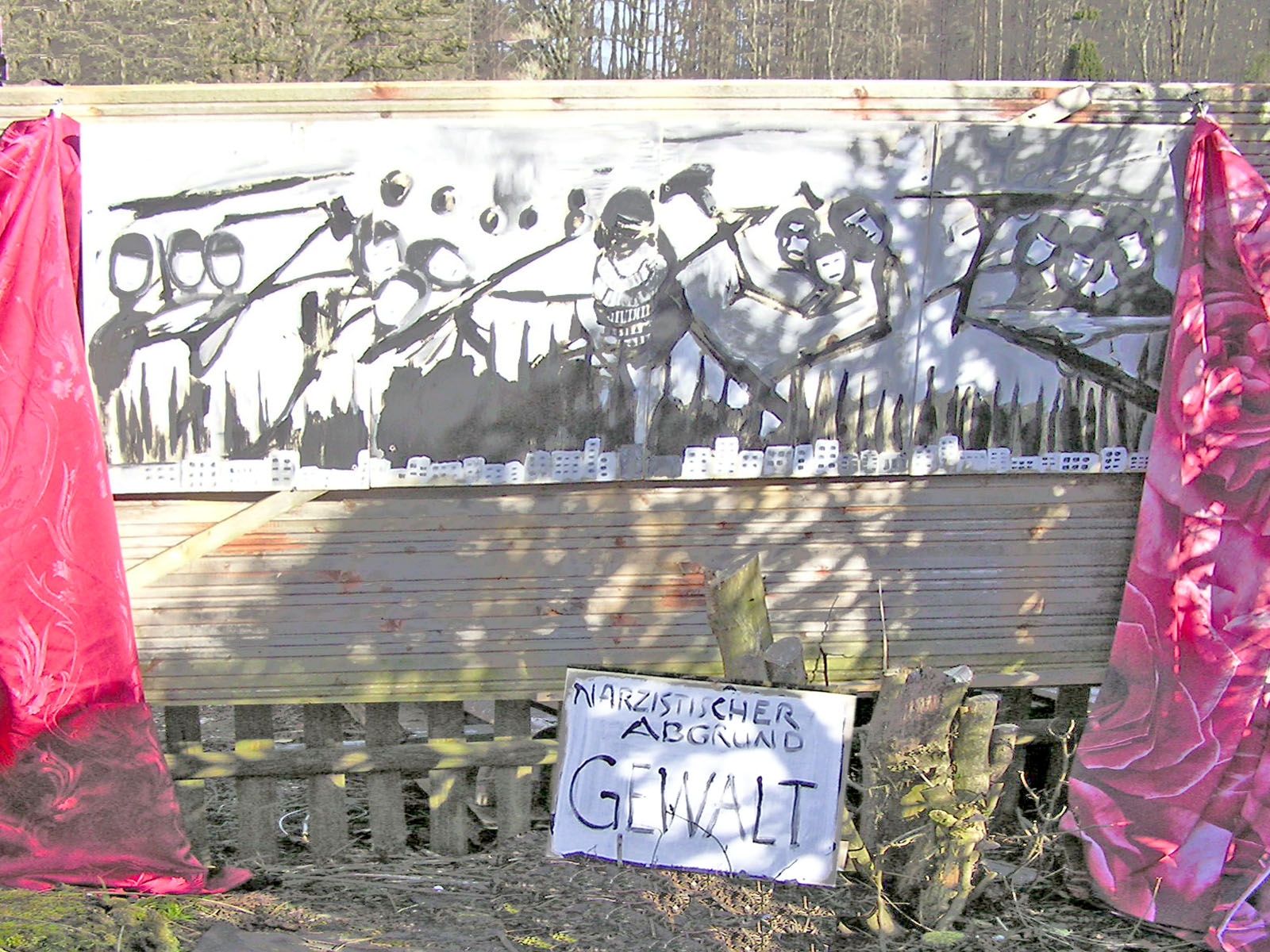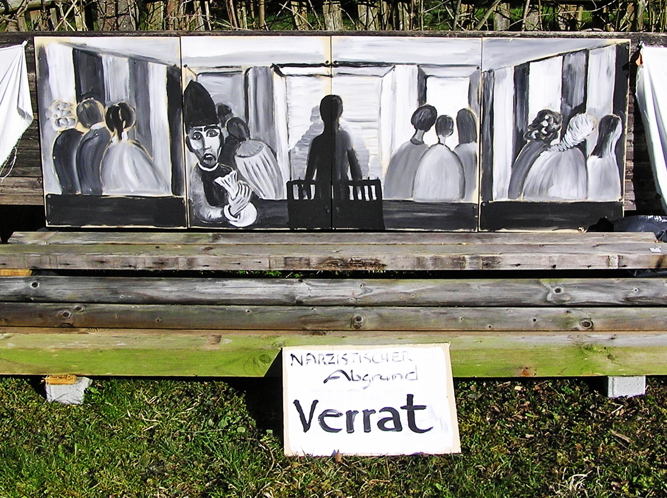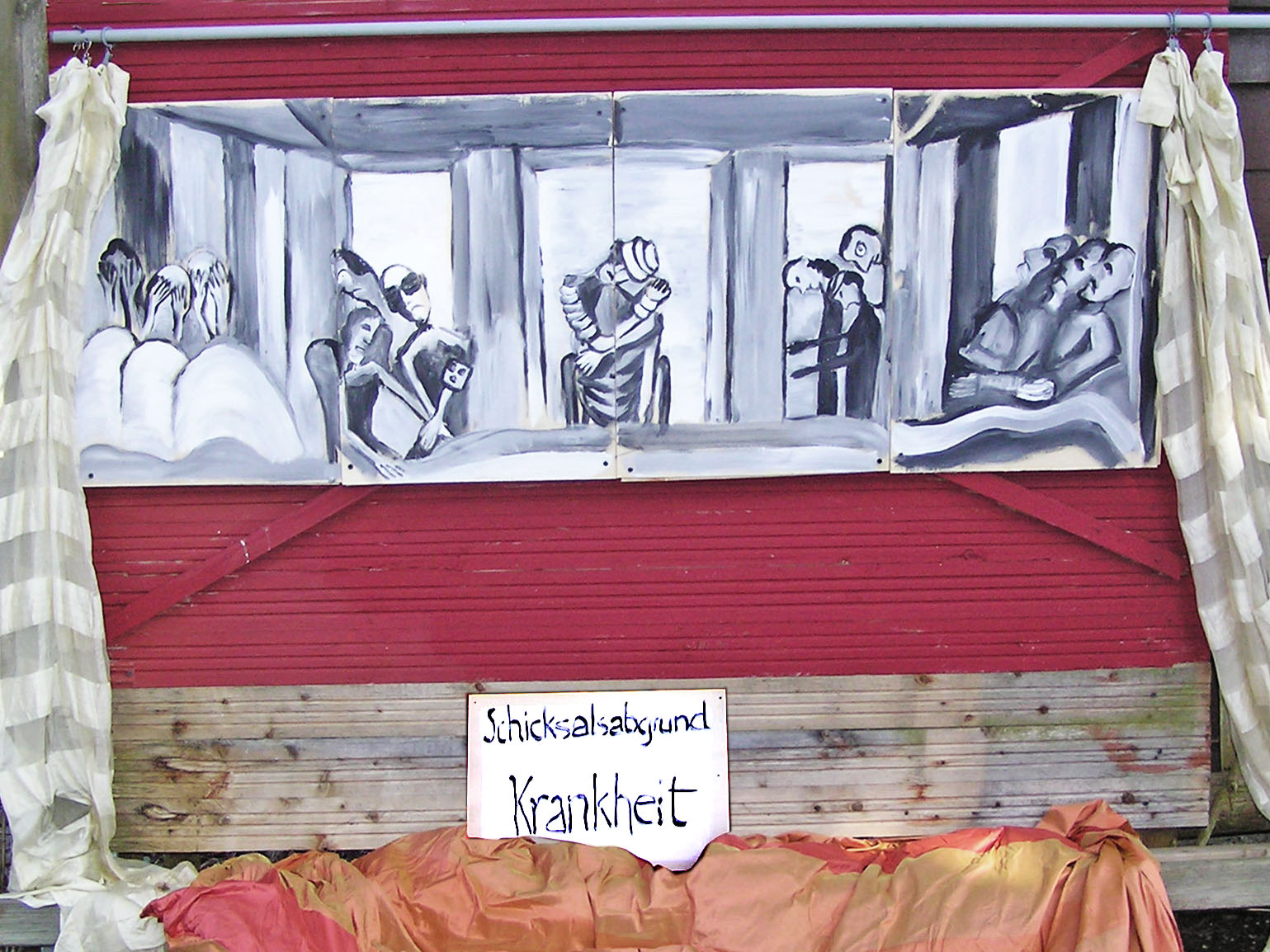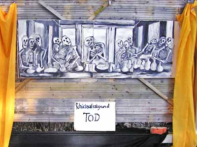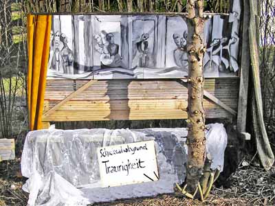 So sitzen die Krieger, die Vermummten, die Bewaffneten, die Gewalttätigen, die Anonymen Zerstörer immer mit dabei, symbolisch unter dem Tisch, wenn andere sich erhoben haben oder meinen, die Welt könnte sich in ein friedliches Miteinander verwandeln. Zu keiner Zeit hat der Mensch die Gewalt in Schranken weisen können, zu keiner Zeit konnten Menschen einander achten und schätzen, zu keiner Zeit, siegte Toleranz und Verständnis, immer saßen und sitzen die Zerstörer und Töter und Peiniger und Folterer und Stalker und Verfolger mit unter dem Tisch. So sitzen sie auch in diesem Bild. Das Zeitlose der Bilder sollen die wehenden Stoffe ausdrücken, sie sind nicht starr, sondern sie bewegen sich im Wind und damit in der Zeit. Bei den Schicksalsabgründen wurden gelbe und weiße und goldenen Stoffe verwendet, denn Tod, Krankheit und Leid sind nicht nur Tiefen und Schrecken, sondern auch Tore zu den Welten und Einsichten und Ergriffenheiten und Erkenntnissen des Goldseins einer Welt, die wir nicht kennen, nur ahnen, einer Welt, außerhalb von uns, die wir als Zielvision brauchen und die wir mehr ahnen oder wünschen als visualisieren können. Das Todesbild ist gar ganz hinter goldene Tücher gelegt, so als wollte es sagen: Denke jeden Tag an den Tod, er gehört auch Dir, und die Möglichkeit, dass Du nach einer Welt oder nach einem Leben, das durch schwere Ereignisse und Phasen des Grauens erschüttert war, in goldene Sphären eintrittst, ist zumindest eine Option. Beim Auf-er-stehungsbild bleibt die Dualität von Gut und Böse. Das Gute in der Hälfte des Bildes, das Böse unter der weißen Tischdecke, das Gute helle weiße Tuch links und rechts, sich in der Zeit mit dem Wind bewegend und das Böse dunkle schwarze Tuch unmittelbar daneben, unausrinnbar. Neben diesen Bildern zu Ostern 2016 hängt noch mein Bild Ökumene am Kunsthaus am Wörthsee. Es wurde 2001 gemalt, stellt die Versammlung der Männer UND Frauen und der evangelischen UND katholischen Christinnen und Christen dar. Eine Gemeinschaft, die vor 15 Jahren ebenso eine Illusion war, wie heute. Trotzdem sollte sie im Bild eine Wirklichkeit finden. Mein Dank gilt meinen denkenden Mitarbeiterinnen und Unterstützerinnen, die mich immer wieder abregten, ermahnten, kritisierten, ermunterten und liebevoll annahmen: Frau Marianne F., Herr Andreas R, Frau Monika F., Herr Heiner F., Frau Verena S., Frau Brigitte H., Herr Franz-Josef St, Frau Erika S. und allen anderen, an meiner Wegesseite. Dr.phil. Dipl.-Ing. Gisela Forster OstR.Bildh.Künstl.PDL www.kulturstrasse.de |