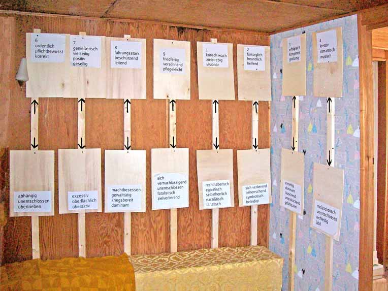 Station 10![]() Im Nebenraum finden Sie Charaktereigenschaften der 9 Typen, oben in der positiven Ausdrucksweise, darunter mit dem Pfeil nach unten in einer krankmachenden oder gefährlichen Ausdrucksmöglichkeit. |
