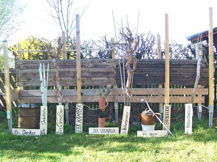 Station 8![]() Weiter Richtung Straße, am Haus vorbei, stoßen Sie auf eine abstrakte Darstellung des Enneagramms. - Links der Denker in der Eisentonne mit den Steinen, - dann der Ordentliche aus weißen Eisenstangen, - dann der Genießer als verzweigter Ast, - dann der Kämpfer als große Senkrechte mit einer Eisenstange mit einer Gabel an der Seite, - dann der Vermittler, zwei Tonrollen in Verbindung, darüber sanfte Zweige nach allen Richtungen, - dann der Weltverbesserer, aktive stürmische Hölzer, dazwischen Stangen aus grauem Eisen, - dann der Helfer, als Ausgießender, mit Kanne und Krücke, - dann der Erfolgreiche, eine senkrechte dünne Stange, - dann der Melancholisch-Musische, als gewundenes Holz. Überlegen Sie, wo Sie selbst sich sehen. Überlegen Sie auch, wo Familienangehörige, mit denen Sie sich verstehen oder nicht verstehen, sein könnten. Sehen Sie an den Formen, dass manches nicht zusammenpasst, anderes sich ergänzt. |